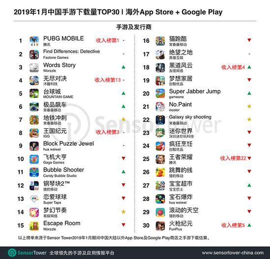 移动市场研究机构Sensor Tower发布《2019年1月中国手游下载量TOP30》榜单,腾讯旗下战术竞技手游《PUBG Mobile》第三度蝉联榜首,上演帽子戏法,顺利完成独霸收入、下载两榜成就。